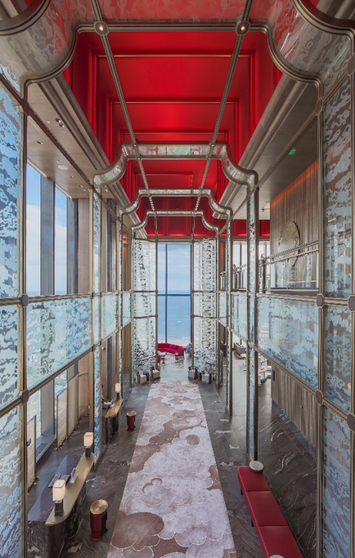 视野开阔的大厅里伫立着青岛本地雕塑家隋建国为酒店创作完成的当代艺术雕塑《启云》,寓意“启云半峰凌霄处,临风绝顶钓鱼台”,代表了这座高耸入云的空中府邸将以当代中国的待客之道、主人之姿,迎接八方来客,宏图远志不言自显。