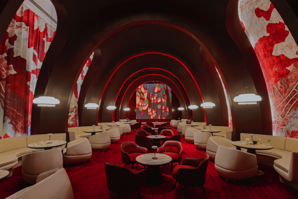 红HONG酒吧的灵感来自音乐、电影和调酒艺术,巨型的红玻璃玛瑙壁柜陈列着来自世界各地的佳酿和陈年烈酒,也收藏了你愿意与人分享的细腻情绪。