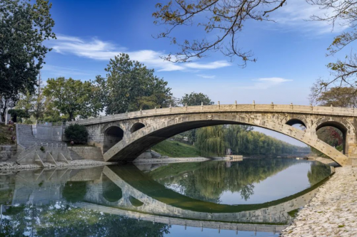 赵州桥又称安济桥,坐落在石家庄市赵县的洨河之上。始建于隋代,由隋匠李春设计建造,距今已有1400多年的历史,是当今世界上现存最早、保存最完好、单拱跨度最大的单拱、坦弧、敞肩石拱桥。