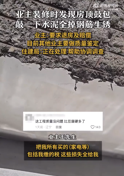 装修发现房顶一敲就碎露出生锈钢筋 多方回应