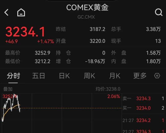 金价突发巨震 一度重回3240美元 市场风险偏好推升