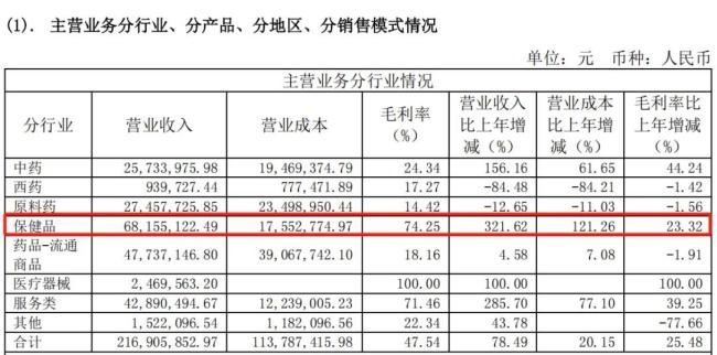 2024年,ST目药的业绩变化,主要来自铁皮枫斗、臻庭配制酒、白花蛇草水等新增的保健品业务,实现收入0.68亿元,同比增长321.62%,成为公司第一大业务;毛利率74.15%,妥妥的业绩担当。