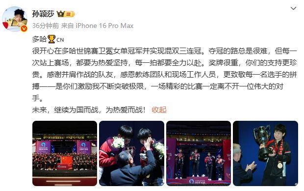 孙颖莎在多哈世乒赛上卫冕女单冠军,并实现混双三连冠。她表示,夺冠之路充满挑战,但每次站上赛场都要全力以赴,每一拍都倾尽全力。奖牌的重量与支持者的鼓励同样珍贵。她感谢队友、教练团队和现场工作人员,也致敬每一位选手的努力,认为精彩的比赛离不开伟大的对手。