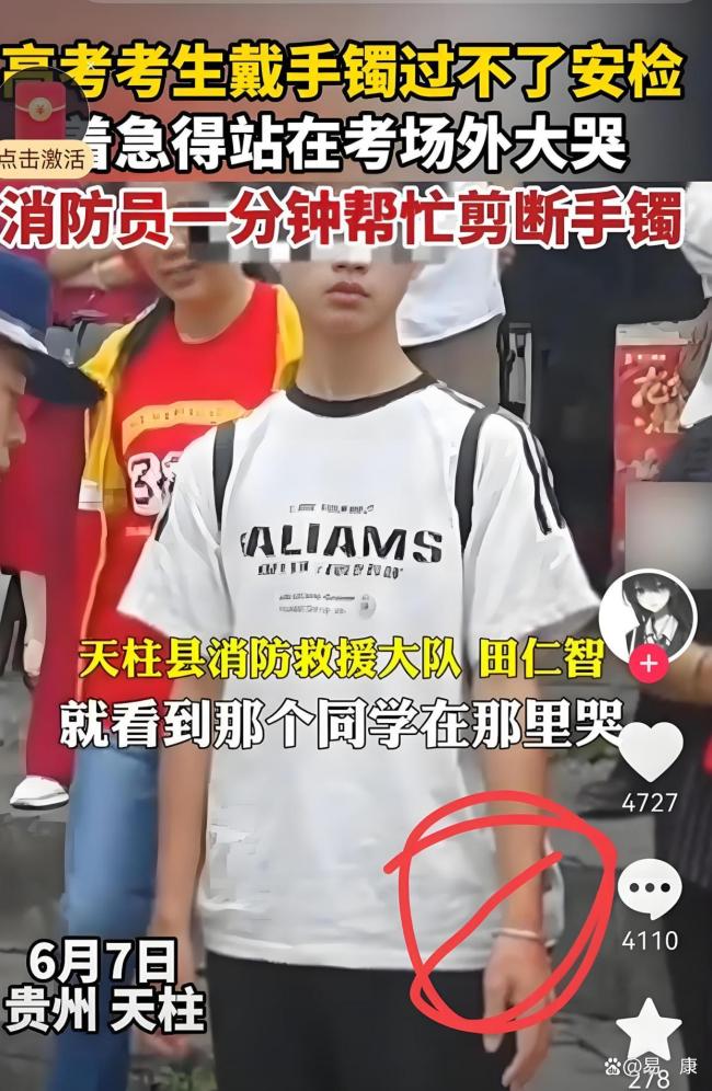 消防员帮考生剪断手镯 考场外的“生死时速”!2025年6月7日清晨,贵州黔东南某高考考点外,考生小李站在安检门前焦急万分。距离语文开考只剩11分钟,他的左手银镯触发了金属探测仪的警报。安检员告诉他金属饰品不能带入考场,这让小李瞬间慌了神。他试图将手镯往手腕根部滑动,但从小佩戴的银镯早已卡住青春期猛长的手腕关节。时间一分一秒流逝,其他考生陆续入场,小李急得蹲在地上嚎啕大哭。