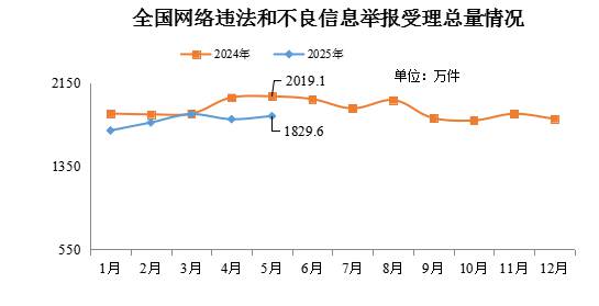 2025年5月全国受理网络违法和不良信息举报1829.6万件