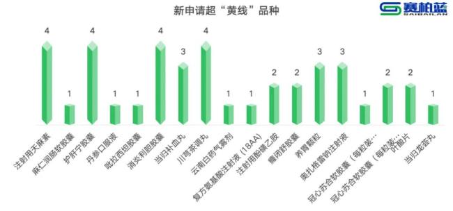 新申请超“黄线”品种中,注射用天麻素、护肝宁胶囊、消炎利胆胶囊均已被点名4次。新申请超“黄线”药品按超黄线幅度降序排列,药品被点名情况如下: