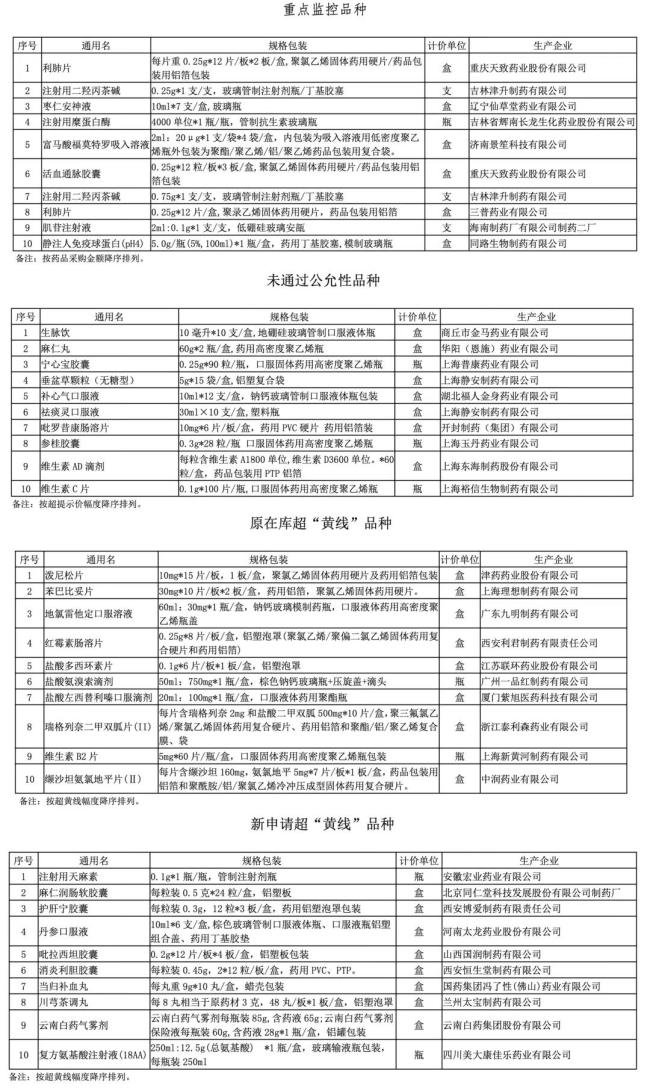 上海每批公布的重点监控品种名单按药品采购金额降序排列,具体如下: