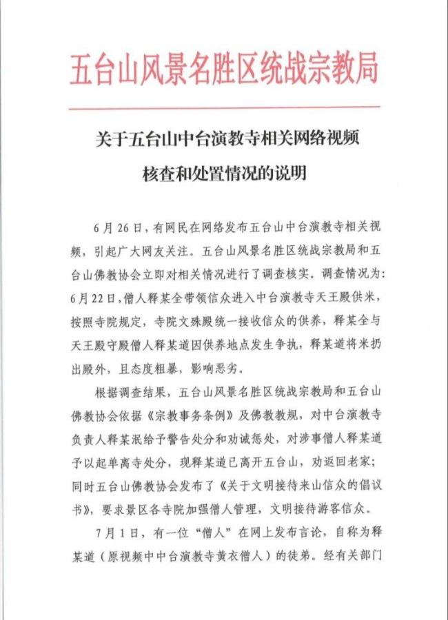 7月1日,一位自称是释某道徒弟的“僧人”在网上发布言论。经有关部门核查,该视频发布者刘某某为陕西绥德人,并非中台演教寺僧人,且释某道从未收过徒弟。经过全景区排查,此人并非五台山僧人,在中国佛教协会佛教教职人员信息查询网中也未查询到其相关信息。