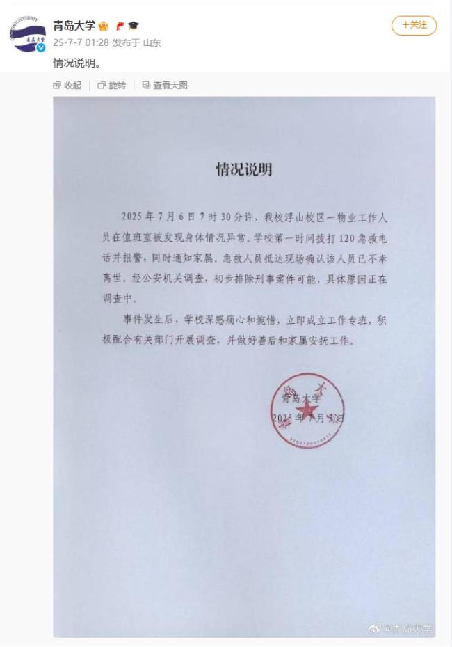 明德物业回应青岛大学宿管离世 初步排除刑事案件。7月7日,青岛大学发布情况说明,称2025年7月6日早上7时30分左右,浮山校区一名物业工作人员在值班室被发现身体状况异常。学校立即拨打120急救电话并报警,同时通知家属。急救人员到达现场后确认该工作人员已不幸离世。经公安机关初步调查,排除了刑事案件的可能性,具体原因仍在调查中。