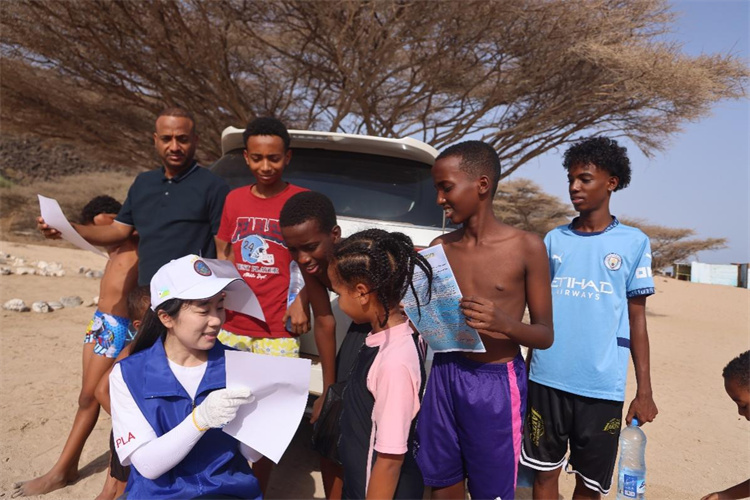 活动期间,基地官兵向当地民众发放环保倡议书,宣介生态文明理念。中国人民解放军驻吉布提保障基地供图