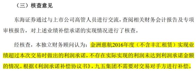 在后续的业绩承诺期内,东海证券也在负责核查丰汇租赁的业绩承诺实现情况,并多次认定“丰汇租赁的年度利润超过交易时作出的业绩承诺”。