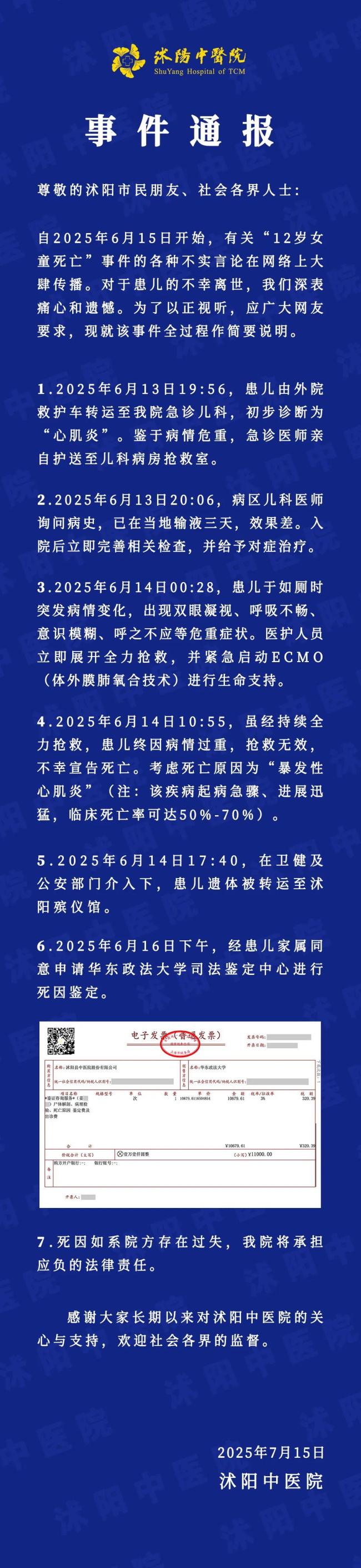 沭阳中医院通报女童死亡事件 真相说明。7月15日,江苏宿迁沭阳中医院发布关于“12岁女童死亡”事件的情况说明。自6月15日开始,有关该事件的各种不实言论在网络上广泛传播。对于患儿的不幸离世,沭阳中医院表示痛心和遗憾,并应广大网友要求,就事件全过程作简要说明。