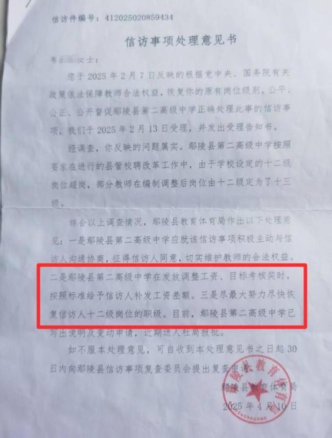 鄢陵县第二高级中学承认未履行岗位给其降低告知义务,并承诺对韦某某的工资福利待遇进行补差。鄢陵县教体局则要求校方按标准补发工资差额,并尽快恢复其岗位职级。然而,韦某某表示,事发至今已经过去数月,工资仍未见“补差”,岗位等级问题也未能解决。