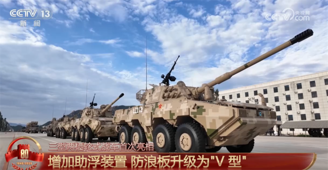 在9月3日的阅兵式上,海军陆战队组成的两栖突击方队展示了三型两栖战车。这些新锐装备实现了火力、机动和防护性能的全面提升。