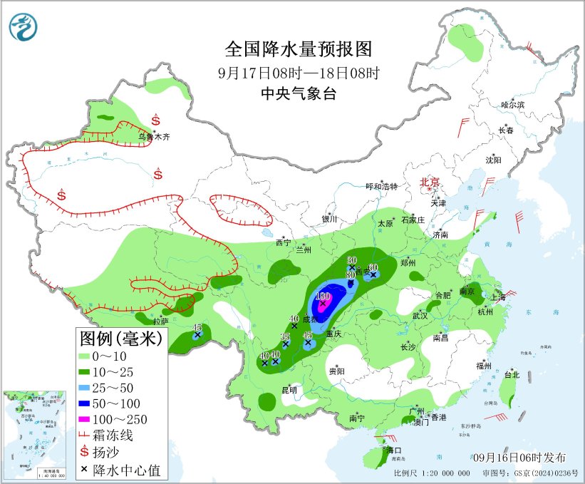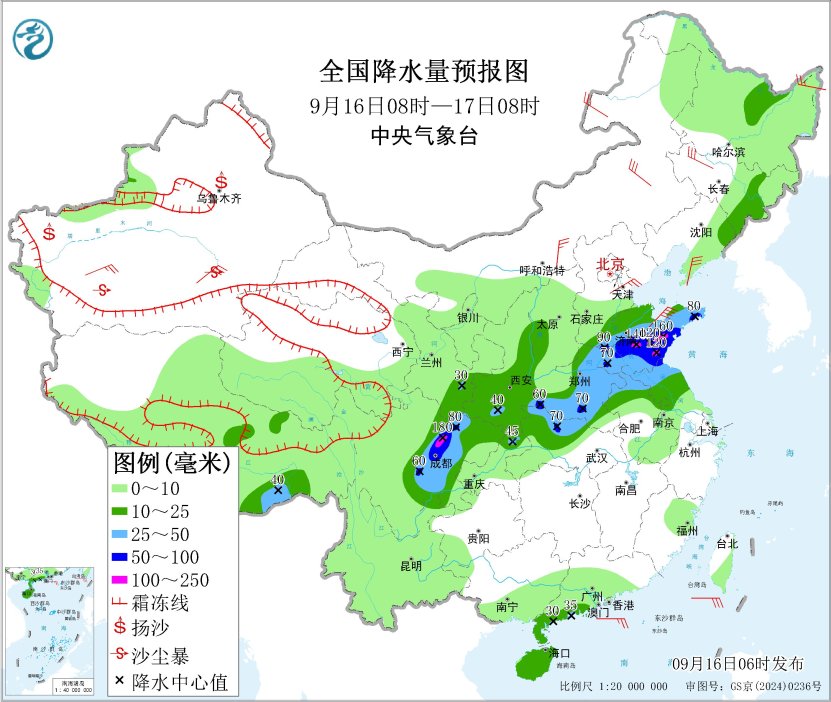 9月16日08时至17日08时,四川盆地中西部、甘肃南部、河南中东部、山东中南部以及苏皖北部等地部分地区有大到暴雨,其中,山东中南部、四川盆地北部等地部分地区有大暴雨(100~180毫米)。新疆南疆盆地、内蒙古中东部、黑龙江东北部、吉林西部、辽东半岛等地部分地区有5~6级风,渤海、渤海海峡、黄海北部和中部海域将有7~8级、阵风9级的大风。