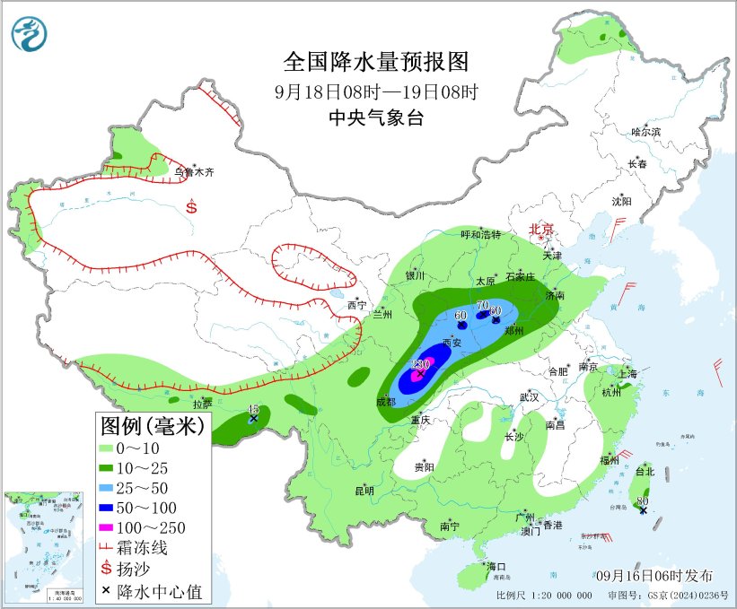 9月18日08时至19日08时,西北地区东部、华北南部、黄淮西部、西南地区东北部等地部分地区有中到大雨,其中,四川盆地北部、陕西中南部、山西南部等地部分地区有暴雨或大暴雨(100~230毫米),黄海大部海域、台湾海峡将有6~7级、阵风8级的偏北到东北风。