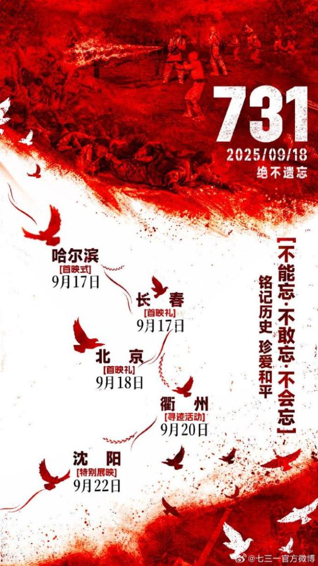 电影《731》英文名为《EVIL UNBOUND》,直译为“罪行无界”。影片将于9月18日在澳大利亚和新西兰上映,次日在美国和加拿大上映。据猫眼专业版数据,《731》预售总票房已破亿,成为春节档后首部预售票房破亿的电影。该片公映时长为125分钟,9月18日9:00起片。国内多地影院的排片表显示,《731》首场放映时间定在当天上午9点18分,并注有“警钟长鸣”的标识。多家影院工作人员表示,尽管影片9点就可以放映,但9点18分这一时间点更有意义。除了“警钟长鸣”特殊场,还有“铭记历史”、“勿忘国耻”、“吾辈自强”等特殊场次。