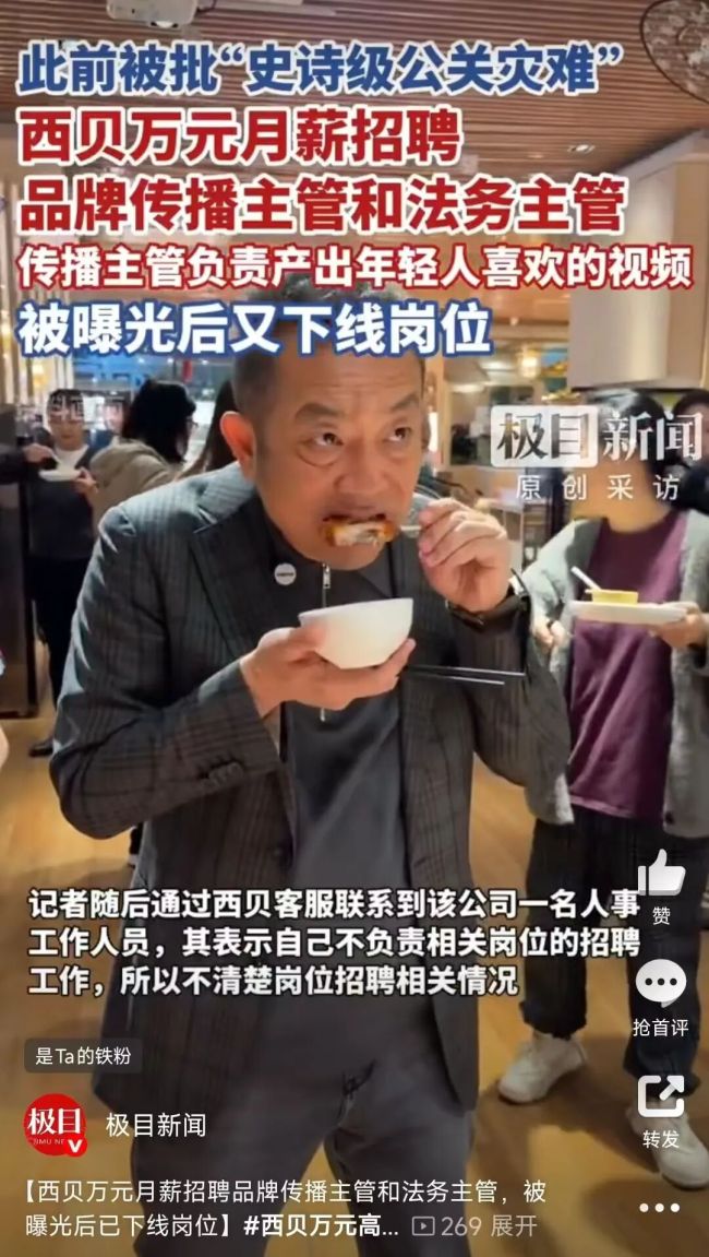 西贝招品牌传播和法务主管,月薪超万元!被曝光后火速下线岗位