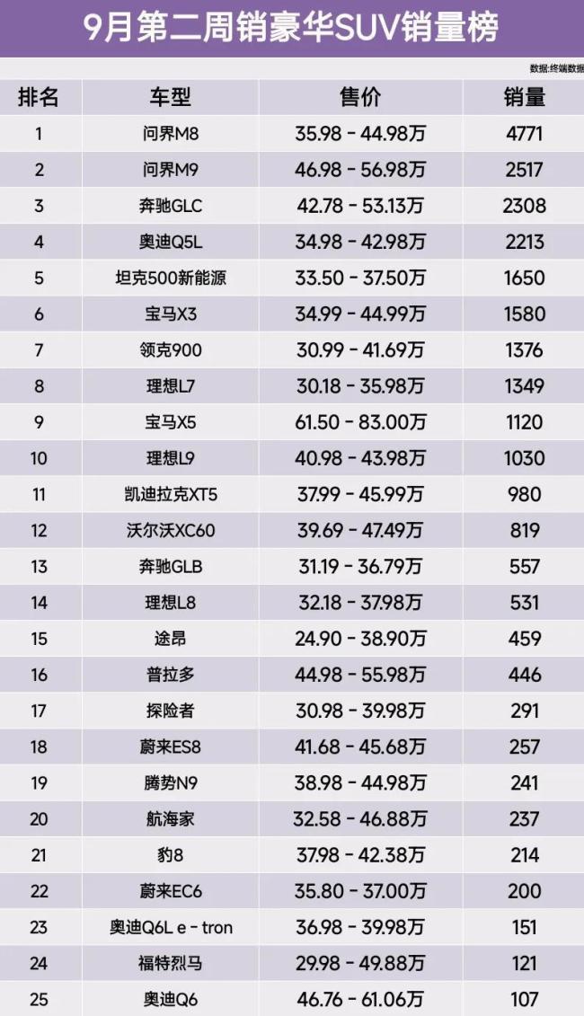问界M8周销4771辆再夺冠豪华SUV榜 市场反响热烈!最近SUV市场非常火爆,品牌之间的竞争也日益激烈。9月份第二周的豪华SUV销量榜单显示,市场变化多端。