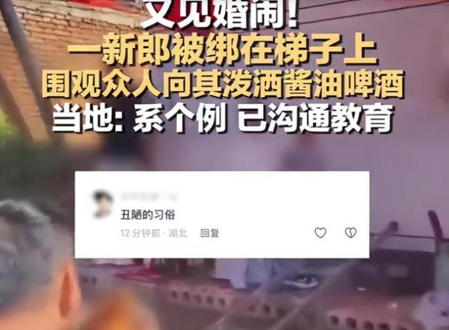 9月21日,一段视频在网络上迅速传播:新郎被紧紧绑在梯子上,啤酒和酱油混合的味道扑鼻而来,旁边几位“朋友”拿着啤酒瓶喷洒,新郎脸上满是无奈,仿佛置身于一场闹剧中。这荒唐的画面让网友纷纷吐槽:“这样的婚闹简直无法直视!”