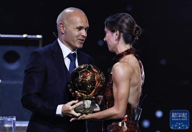 当地时间9月22日,《法国足球》杂志在巴黎夏特莱剧院举办了2025年金球奖颁奖典礼。巴塞罗那队的西班牙球员邦马蒂获颁女足金球奖,这是她连续第三年获得该奖项。在颁奖仪式上,邦马蒂手捧奖杯,并从西班牙足球名宿伊涅斯塔手中接过奖杯。