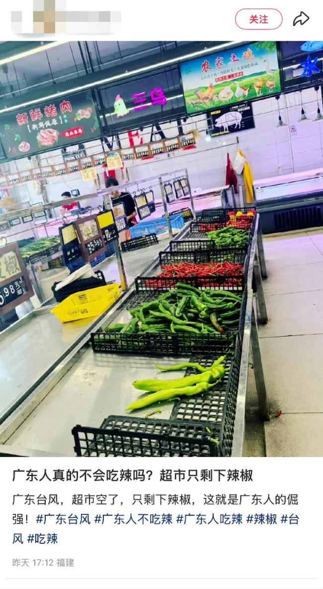 超强台风“桦加沙”即将强势登陆,为了应对可能带来的影响,市民们纷纷前往超市抢购物资。22日有深圳市民发帖称,早上7点多到沃尔玛,发现蔬菜、面包、熟食、鲜肉区都被搬空了,最终空手而归。还有市民晒出“扫货囤粮”的照片,不仅有果蔬蛋奶肉,还有蜡烛。广东广播电视台报道,深圳有商超部分货架已清空,只有辣椒被剩下,相关话题登上热搜。