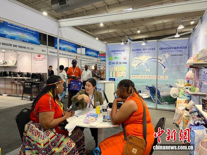 当地时间9月23日,南非—中国贸易投资促进大会暨第九届中国—南非贸易博览会开幕式在南非约翰内斯堡举行。图为南非商人在博览会上与中国展商交流。中新社记者 孙翔 摄