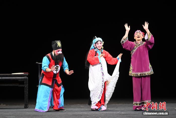 9月23日,福建福州,福建邵武三角戏(傩舞)民俗文化研究中心的演员正在表演三角戏《姑嫂观灯》选段。福建传统折子戏展演正在福州举行,当天,南词戏、三角戏、四平戏、梅林戏等福建稀有剧种集中上演。中新社记者 吕明 摄