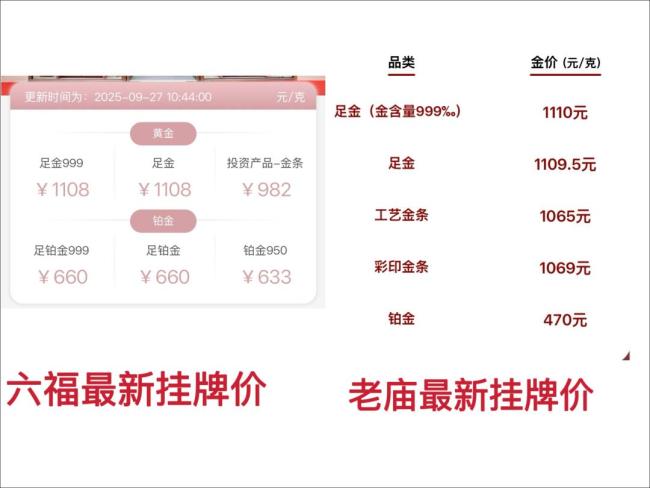 根据9月27日的最新报价,国内传统黄金饰品品牌的价格全线突破1100元/克。当天,周大福、周生生、六福三个品牌的足金报价均为1108元/克,老庙黄金则为1100元/克。