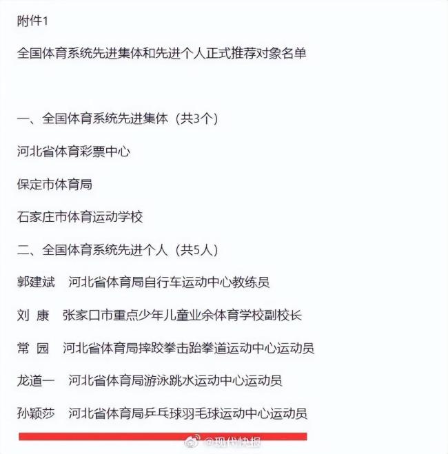 孙颖莎入选全国体育系统先进个人 乒坛新星闪耀国际赛场。9月28日,河北省体育局官方网站公示了全国体育系统先进集体和先进个人的推荐对象名单。郭建斌、刘康、常园、龙道一、孙颖莎等五人被列为先进个人推荐对象。