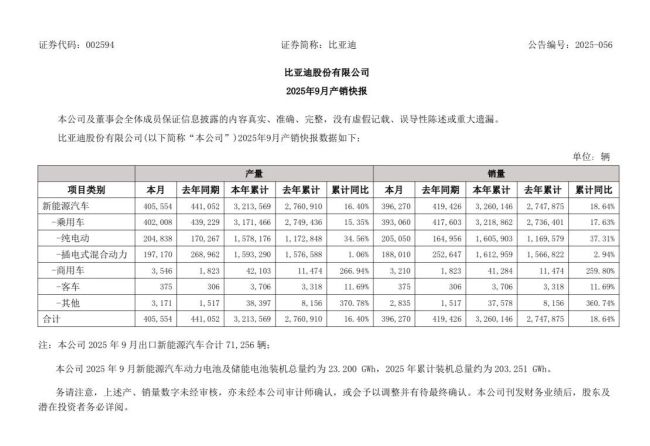 与此同时,比亚迪9月新能源汽车总销量396,270辆,去年同期为419,426辆,同比下滑5.5%。这是比亚迪汽车近年来少有的下滑时刻,该公司上一次销量同比下滑是2024年2月(春节),当时销量为122,311辆,2023年同期为193,655辆。同时,从增速上来看,比亚迪从今年下半年开始,增速突然降低,其中7月增速为0.6%,8月增速为0.1%,基本仅能够与去年持平。