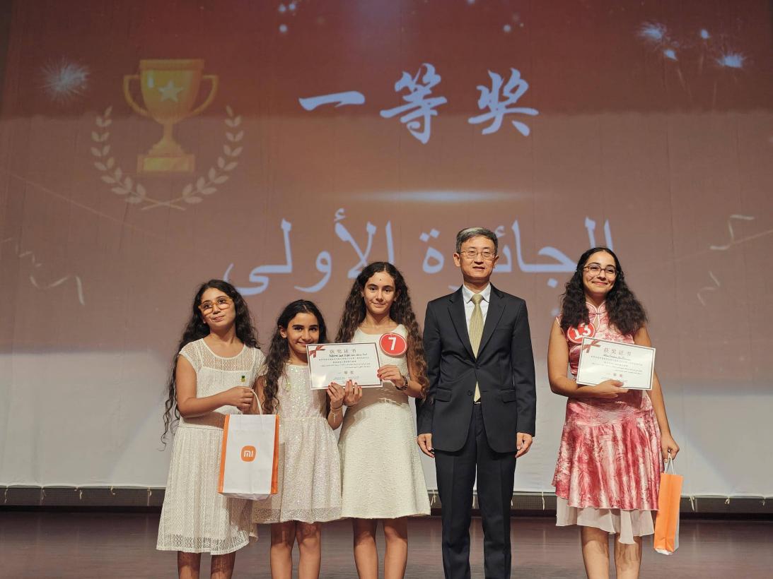中国驻突尼斯大使万黎为一等奖获得者颁奖。迦太基大学孔院供图