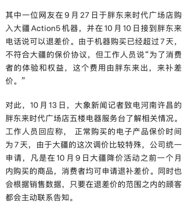 大疆多款产品降价 胖东来主动退差价 消费者获贴心服务