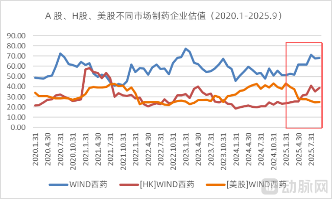 如果以2020年1月31日为基期(估值水平定为100),9月30日A股、港股、美股三个市场西药行业的相对估值水平为130.41、179.66和73.54。不同市场投资者情绪的差距十分明显。尤其在2025年之后,美股与A股、H股的变化方向截然相反。