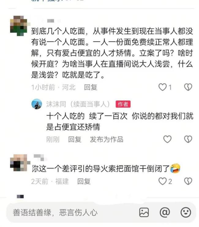 马女士展示了私信中的谩骂内容,如“你用小孩去敲诈别人,你们都会一起下地狱,不得好死”“你是真贱”等。9月23日,面馆老板发视频称要永久关店,并承诺会亲自给她道歉并作出赔偿。然而直到10月16日,马女士既没有见到面馆老板,也没有接到他的电话。