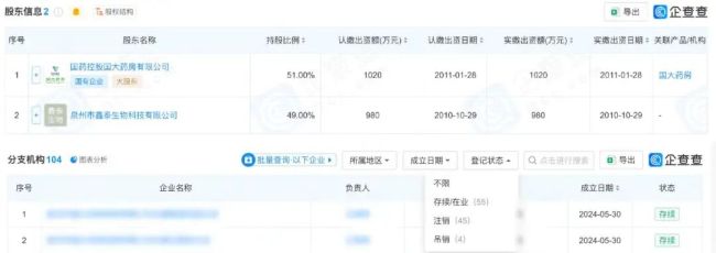截至10月21日,泉州市国大药房连锁有限公司已设立104家分支机构,其中注销45家、吊销4家、存续/在业55家,同样存在一定规模的门店调整。