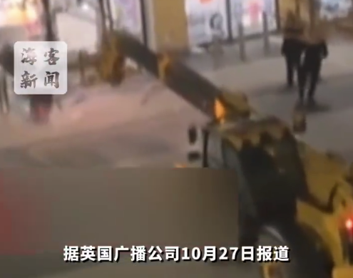 英国犯罪团伙开挖掘机抢劫,猛撞超市大门,直接把ATM机整个搬走。