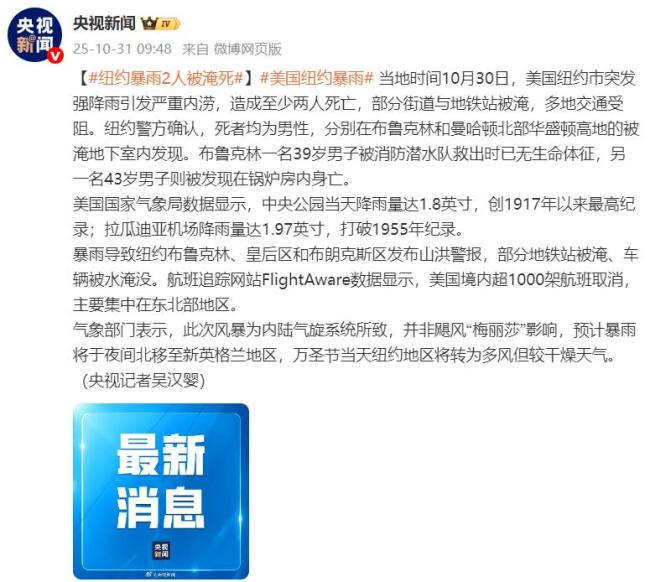 美国超1000架航班取消 暴雨引发交通瘫痪!当地时间10月30日,美国纽约市遭遇强降雨,引发严重内涝,导致至少两人死亡。部分街道与地铁站被淹,多地交通受阻。纽约警方确认,死者均为男性,分别在布鲁克林和曼哈顿北部华盛顿高地的被淹地下室内发现。其中,布鲁克林一名39岁男子被消防潜水队救出时已无生命体征,另一名43岁男子则被发现在锅炉房内身亡。