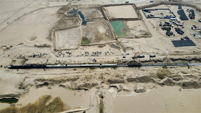 经过多方研究,项目最终摸索出了六套降水(降低水位)方案,分别运用于不同工况。为了保护周围的土壤及生态平衡,还采用了“地表回灌”措施:在降水管沟附近,用现场沙围出一个水池,收集泵站抽出的地下水;这些水通过地表慢慢渗入地下,实现地下水的平衡;渗透的余水则用于路基和管沟回填的拌合用水,也解决了沙漠地区取水难的问题。项目还建有一套小型海水淡化设备,将地下水处理后用于混凝土等要求淡水施工的部位。