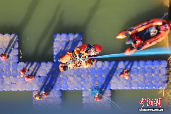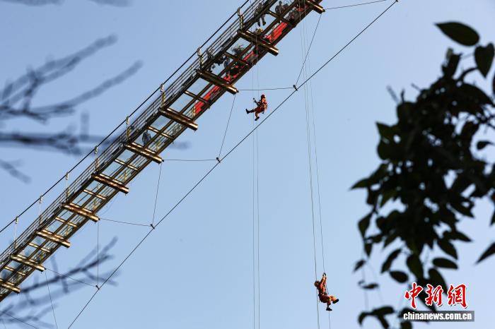 图为消防人员在高空中利用绳索救援系统转运“被困者”。袁唐伟 摄