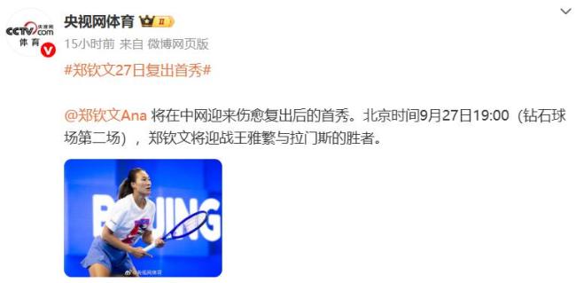 张雨霏去看郑钦文训练了 为复出首秀加油9月24日,中国网球运动员郑钦文确认将在中网迎来中国赛季的首秀。她将于9月27日登场,迎战王雅繁与拉门斯之间的胜者。这是她接受手肘手术后的复出首秀。9月23日,中国游泳运动员张雨霏出现在郑钦文训练的网球馆外,观看她的训练