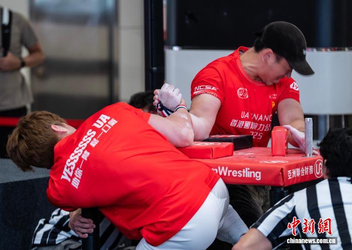 香港举办腕力公开赛 壮汉比拼手腕力量图为两名参赛选手奋力争胜。中新网记者 侯宇 摄 图为两名参赛选手奋力争胜。中新网记者 侯宇 摄
