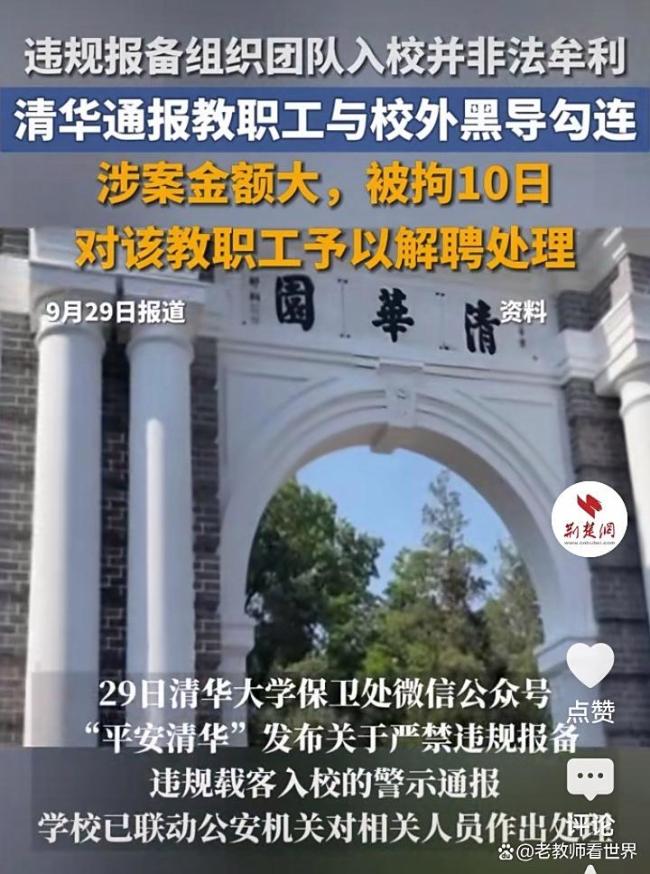 清华大学多名教职工被行拘 违规报备引发关注如今,连进清华大学逛一逛都可能需要找“黄牛”。这些“黄牛”通常出现在热门演唱会门口或春运火车站,现在他们的战场变成了中国顶尖学府——清华园