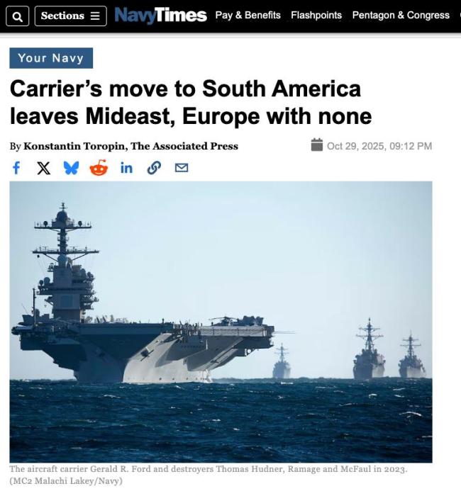 美军航母频现“真空期” 中东海域无航母部署美国《海军时报》报道,以色列与哈马斯互相指责对方违反停火协议之际,美国政府将“福特”号航母从地中海撤出,部署到拉美周边水域执行打击贩毒任务。这一调动让美国面临罕见局面,即仅有一艘航母处于部署状态,且在欧洲和中东附近海域均无航母部署
