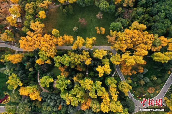 青海西宁秋色美 市民乐享秋日时光10月16日,航拍青海省西宁植物园。随着气温不断降低,西宁市彩叶树木层林尽染,吸引不少市民前来赏秋。 (无人机照片)张忠苹 摄