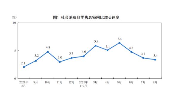 国家统计局:8月份社会消费品零售总额增长3.4%中新网9月15日电 据国家统计局网站消息,8月份,社会消费品零售总额39668亿元,同比增长3.4%。其中,除汽车以外的消费品零售额35575亿元,增长3.7%。1—8月份,社会消费品零售总额323906亿元,增长4.6%。其中,除汽车