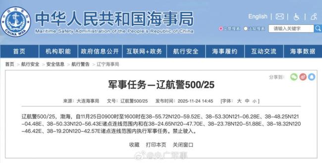 航行警告 黄海北部连续4天实弹射击 禁止驶入大连海事局发布航行警告,自11月25日9时至16时,渤海部分海域执行军事任务;自11月25日8时至28日12时,黄海北部部分海域实弹射击,禁止驶入