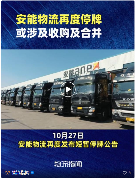 安能物流再度短暂停牌10月27日上午,安能物流再度发布短暂停牌公告。