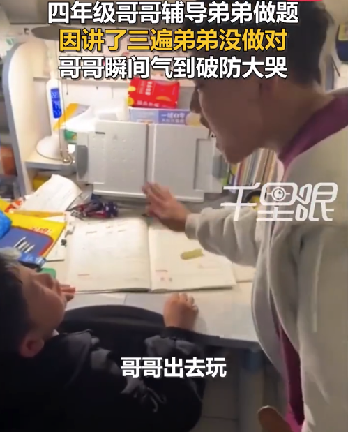 4年级哥哥辅导3年级弟弟被气哭 妈妈:我也崩溃了10月22日,河北沧州。四年级哥哥辅导三年级弟弟做题,讲好几遍弟弟都没懂,哥哥被气得大哭。妈妈刘女士称,开始是自己讲了好几遍崩溃了,晚饭也没做,哥哥出去玩回来饿了,主动说他来辅导,让妈妈去做饭,但弟弟还是坚持自己的想法,哥哥就被气哭了。...