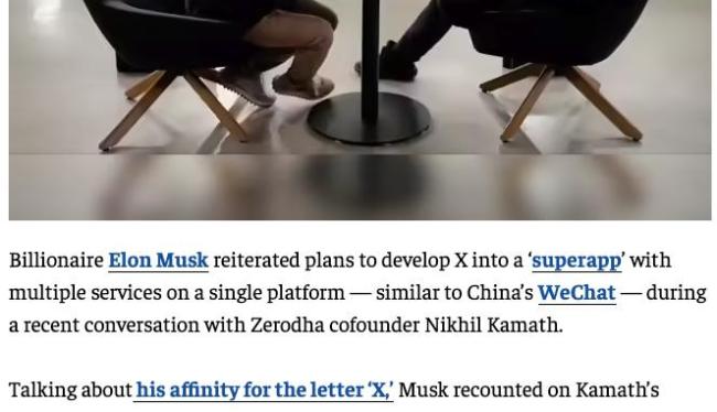 马斯克称想将X打造成微信升级版 构建超级应用愿景特斯拉首席执行官埃隆·马斯克在与Zerodha联合创始人尼基尔·卡马斯的对话中表示,他希望将社交平台X打造成中国以外的“微信升级版”,使其具备信息发布和金融支付等多种功能。这次交流是在播客节目“People by WTF”中进行的